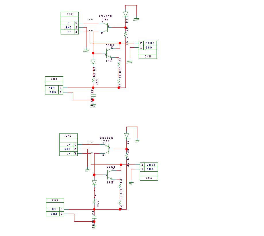 この基板はコンデンサでDCをカットするのが基本です。 そのままAMPに繋ぐと壊れる危険性がありますのでご注意ください。
