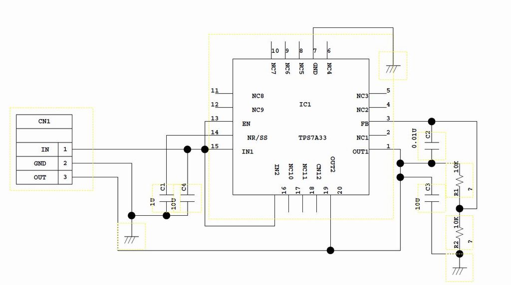 この例では15Vが欲しいのでR2を3.3Kとした場合R1は38.97kΩですので39kΩが使えます。