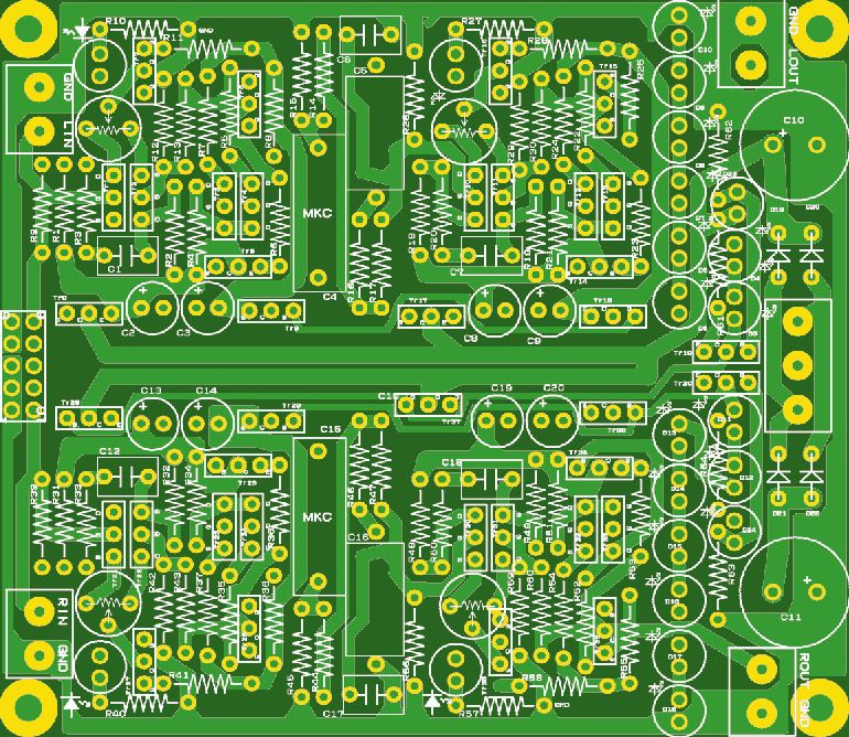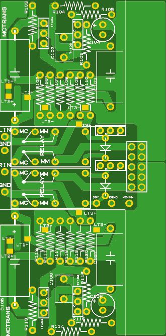 当初はシンプルにこじんまりとして作るつもりだったのですが、あれもこれもと欲が出てえらく回路規模がおおきくなってしまいました。私はソフトンさんの MCトランスを持っているのでMCトランス用の小基板を作りました、本体はただのフォノイコのみに対応MCは小基板でと考えました、実際にアートワークをはじめるとトランスのスペースが大きいのでトランスを載せない時はトランジスタのMCAMPのパターンを入れ込みどちらでも使えて比較したくなり、ペルケさんのホームページで見つけた2石MCヘッドアンプが気に入って両方入れたので抵抗だけで60本を越えてしまいました。せっかくだからこのまま行こうかと思います。