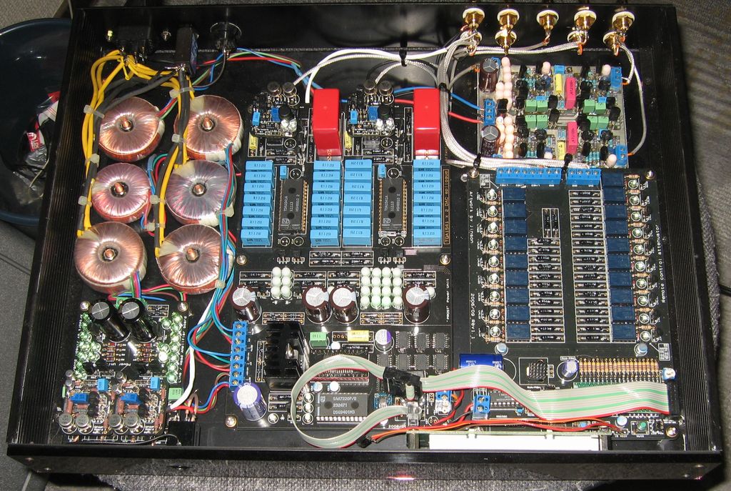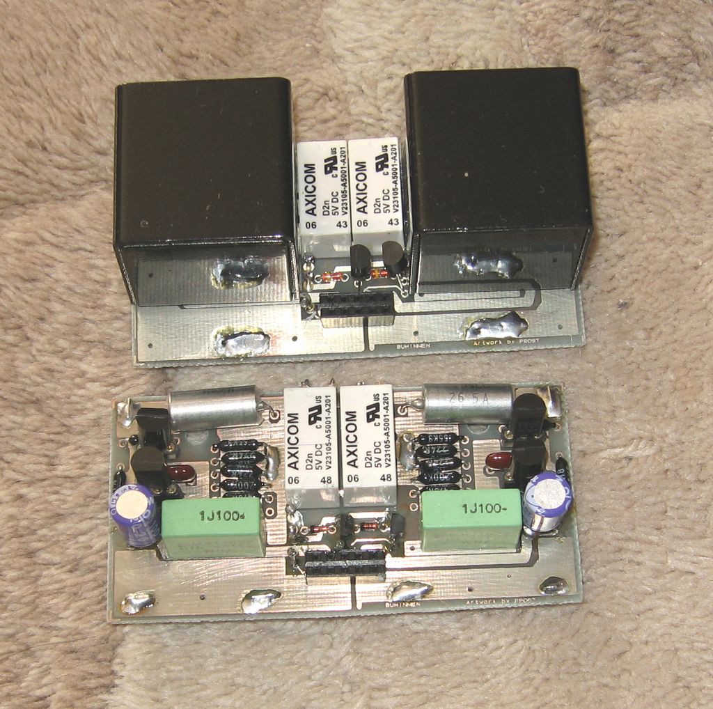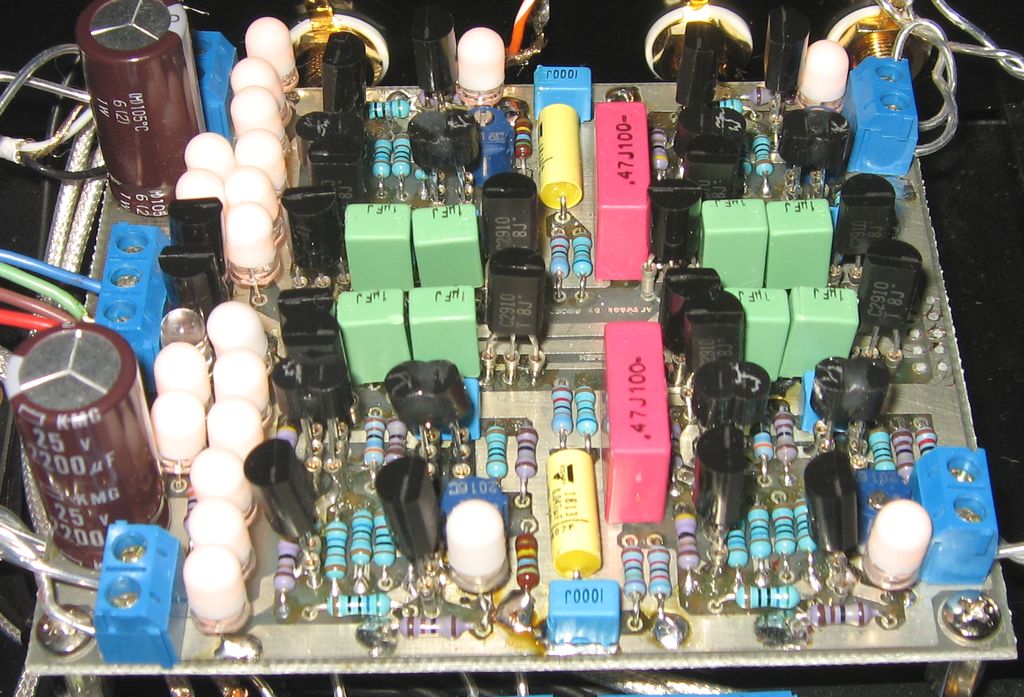 MCHeadAmp基板が完成しました。スペースがないのでPhonoEQ基板の上に伏せる形で載せました。上の方にある黒くて四角いのがソフトンさんのMC昇圧トランス。http://www.icl.co.jp/audio/PLT-1/PLT-1.htm白いのがMM/MC切り替えリレー、ソフトンの善本さんにいただきました、感謝です。少しエージングしただけでとても良い音で鳴ってくれます。ちょっとハムが取りきれない(曲間の無音部分で目立つ)のでこれからハムとの戦いです。