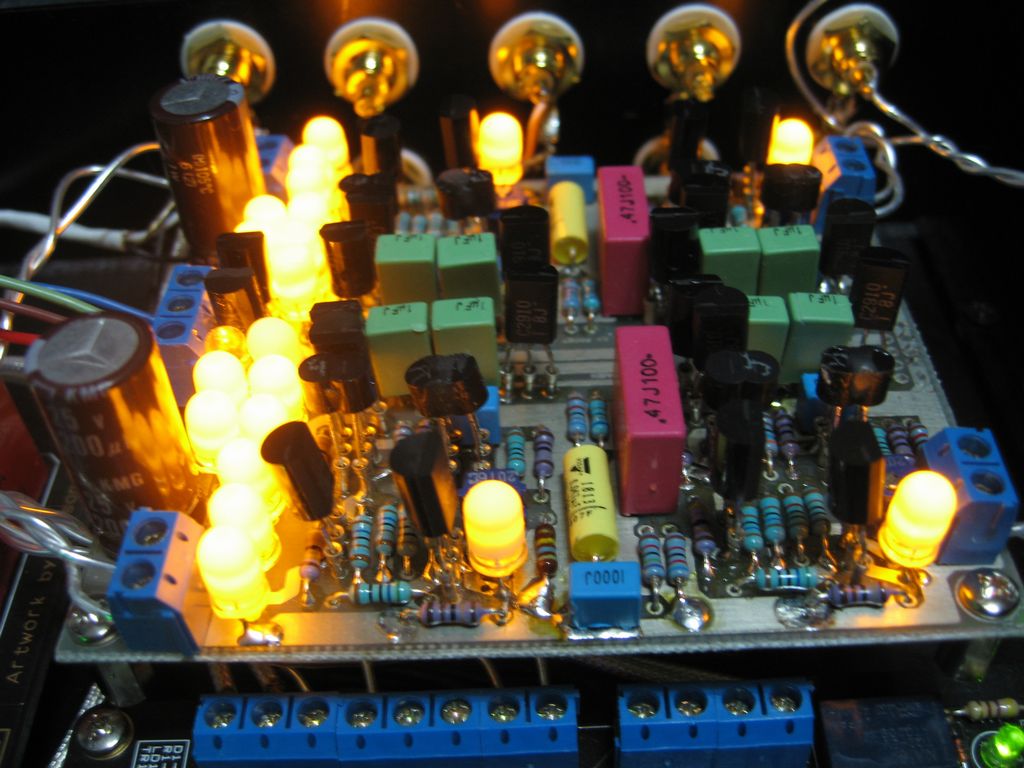 これがプリアンプ本体に組み込んだ状態です、かなり明るくくっきり見えます、明るいところでも十分な光量があります。スモークのパネルと相まってちょっとだけメーカー製の雰囲気です。