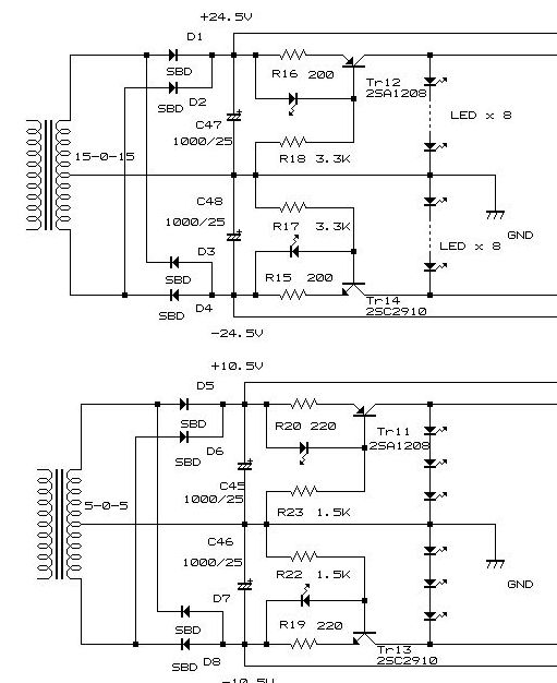極端な例ですがR17、R18を10KΩにして定電流のLEDに1.7mA流してやれば15Vが14.8Vになってなんとか動きます、もっとも定電流の LEDに流す電流だけを減らしても基準電圧を作っているLEDには依然として7mA近い電流が流れてしまうのでR15、R16を200Ωより大きな値にしたいところです、両方のバランス点を探している最中なのでもうしばらくお待ち下さい。±5V系のR22、R23は私の使っているLEDと同じ物なら 1.5Kまでは大丈夫ですしR19、R20は220Ωまでは確認しています、こちらもバランスの良い抵抗値を探っています。デジタル系の5Vは桁違いに電流を食うのでまだ手を付けていません、上記の方法でLEDに流す電流を絞るとテスターで測るDCは十分出ていてもリップルが残ってしまうのでオシロでリップル分を測定しながら決める必要があるので闇雲に抵抗値を上げないようにしてください。文章だけだと分かりにくいので回路図を追加しました。